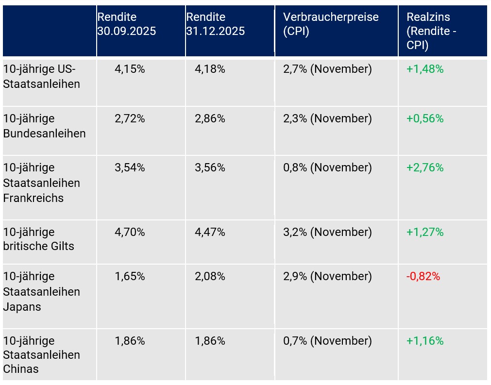 Die Rentenmärkte lieferten im 4. Quartal 2025 keine einheitliche Linie. Immer stärker bestimmen divergente Entwicklungen bei den Themen Staatsdefizite, Konjunkturlagen, Strukturlagen und voraussichtliche Inflationsszenarien die Bewertung an den Rentenmärkten.